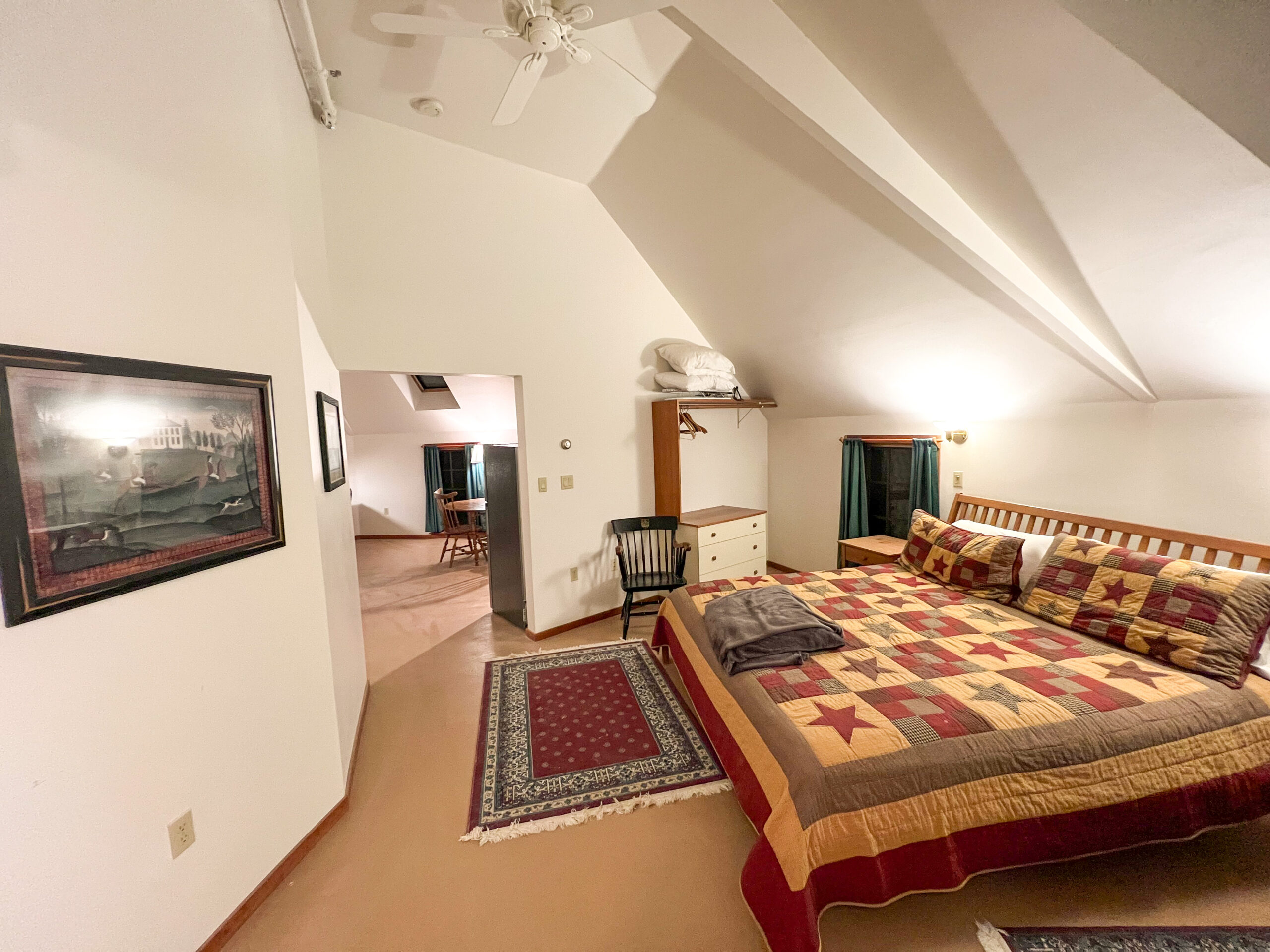 One of two large suites on a private 2nd-floor landing. Access your private suite by the free-standing cherry spiral staircase. There is a king bedroom with a skylight and seasonal gas fireplace, a private bath with double vanity and a Jacuzzi tub & shower, and a fully equipped kitchen and dining area. This suite has a field view. All the comforts of home.