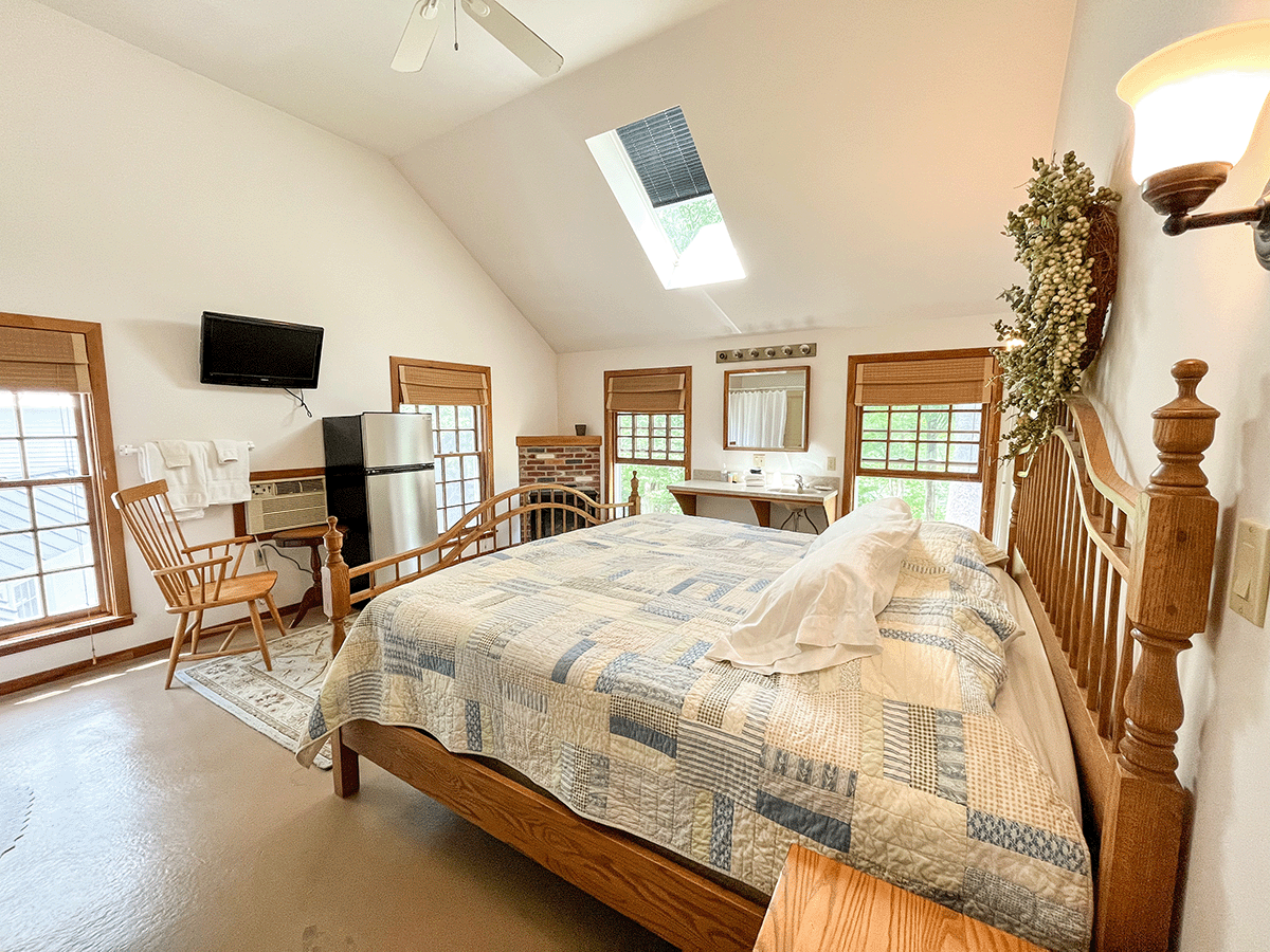 This river-view room with a queen-sized bed provides a touch of simple elegance in this 2nd-floor corner room with a cozy gas fireplace. Take in the views of the river and surrounding fields from four large windows. Private bath with a large tub & shower.